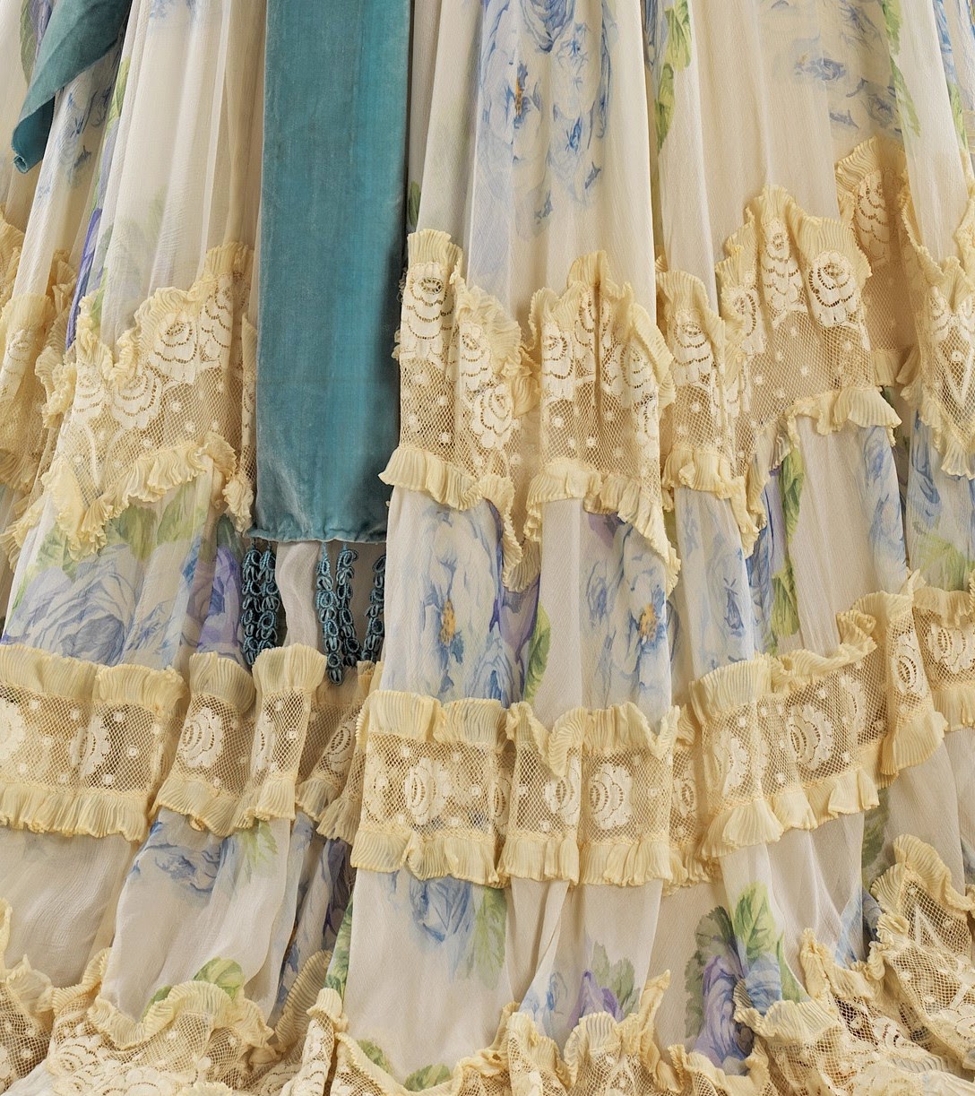 Our first entry today is this detail shot from a late 19th century dress. The word frothy jumped into my head on seeing this image. Certainly this is far too fussy for our current tastes, but in its time it was high fashion, and expertly handled. I love the interaction between the texture of the silk chiffon and the satin, the density of the appliques and the lightness of the bow tie. Its all a delightful looking combination, rendered in subtle colors that keep it from overwhelming the eye. Marvelous.