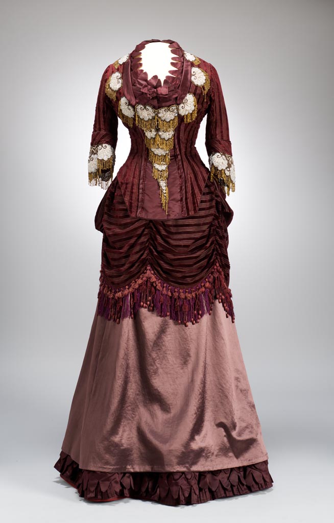 This dinner dress is from 1875. It's a great example of something that could have been great, but through some unfortunate design decisions, isn't great at all. What has to be said before parsing out what went wrong is that in terms of construction, there isn't anything to fault this. Whether it was sewn by the lady who wore it, or it was made for her by a professional dressmaker, the skill set on view is just fine.